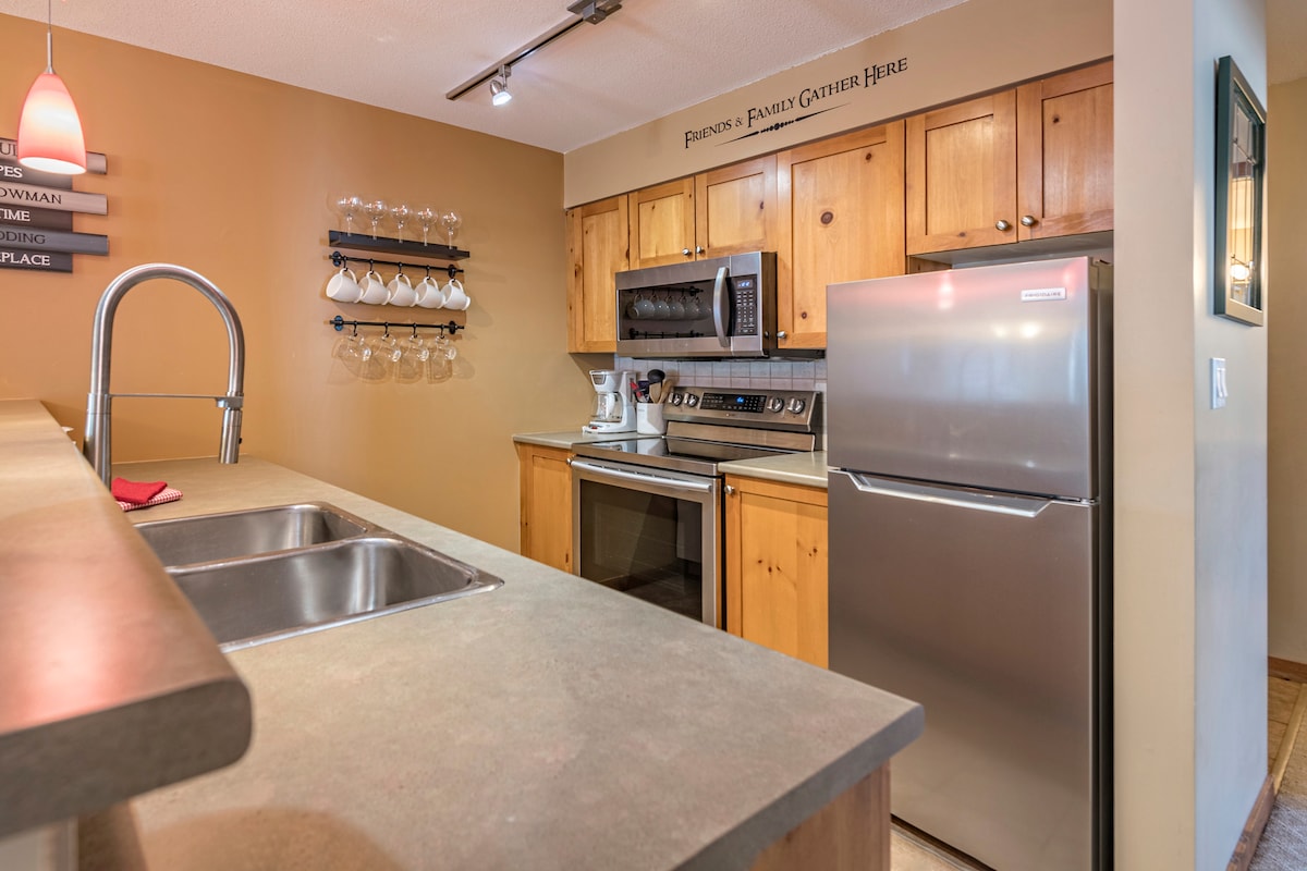 This cozy studio suite located in Creekside just above the Silver Queen Chair is the perfect winter getaway. All high touch areas are cleaned prior to arrival. With covid safety measures resort wide in place our studio nicely sleeps 4 with a Murphy bed and sofa bed. A fully equipped kitchen is waiting and gas fireplace. Close to the Brewers Pond, Tube Town and the bowling alley what more do you need ?