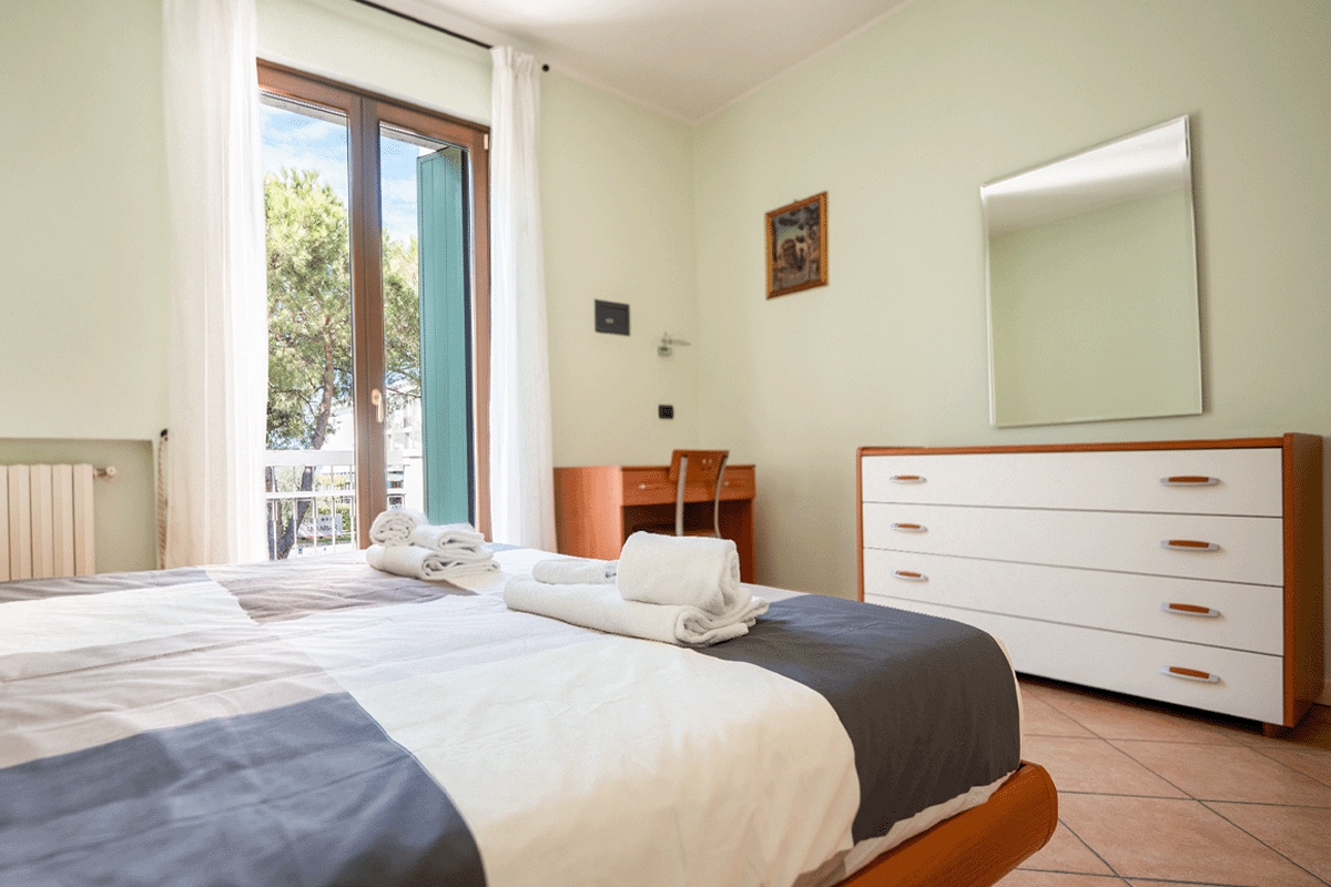 Elegant lakefront location surrounded by greenery. 500 meters from the center, 300 meters from the main beach. 4 bicycles available. Top floor, elevator Equipped with many comforts: living area with a kitchenette, terrace with a view, double bedroom and bedroom with bunk beds. Wonderful panoramic terrace. Uncovered parking space Two bathrooms, the first one with a toilet, washbasin, and bidet, and the second with a shower and washbasin. Parking lot, park, two swimming pools for adults and children, tennis court, ping pong, playground for children, and access to the lake.