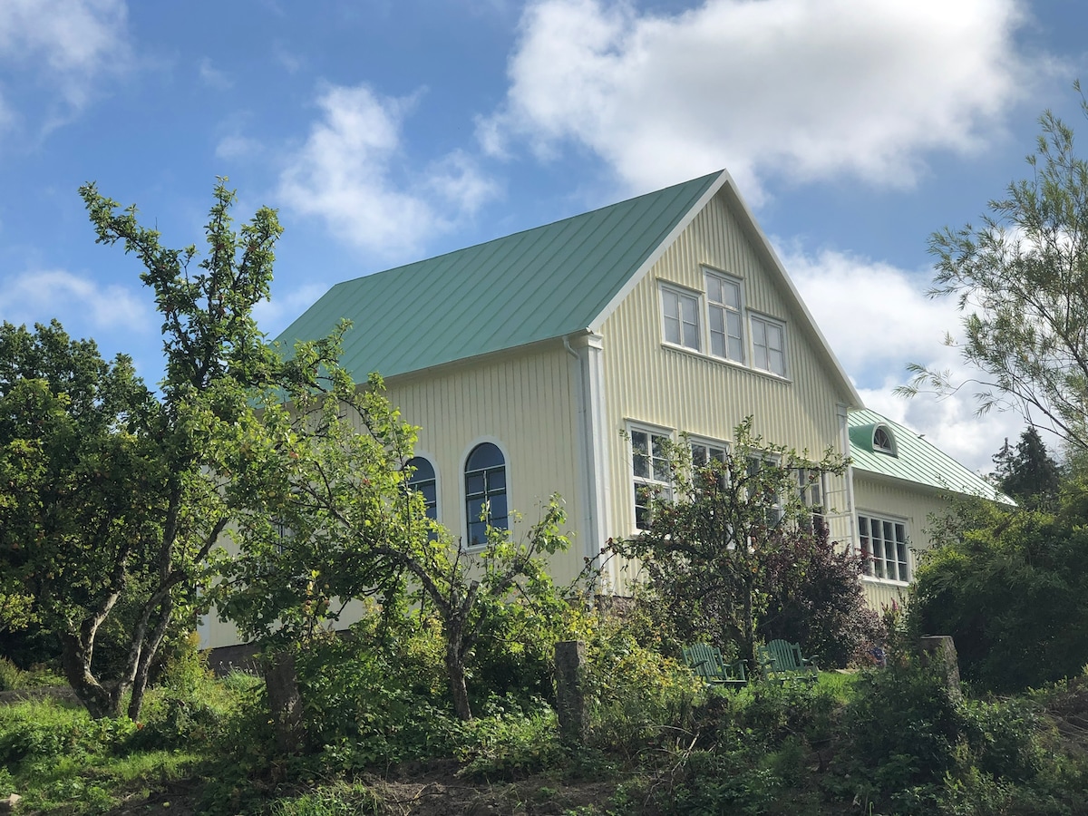 Here you can enjoy fresh air and rural idyll, with unique views of the landscape. Enjoy a chance to experience true peace and quiet. Rent a large, lovely room with an adjoining living area, kitchenette, and dining table. From the entrance hall there is access to a spacious toilet and bathroom. Enjoy the courtyard with outdoor kitchen and grill, and the covered terrace with sunset views of the village church. Free parking in a covered carport with electric car charging available.