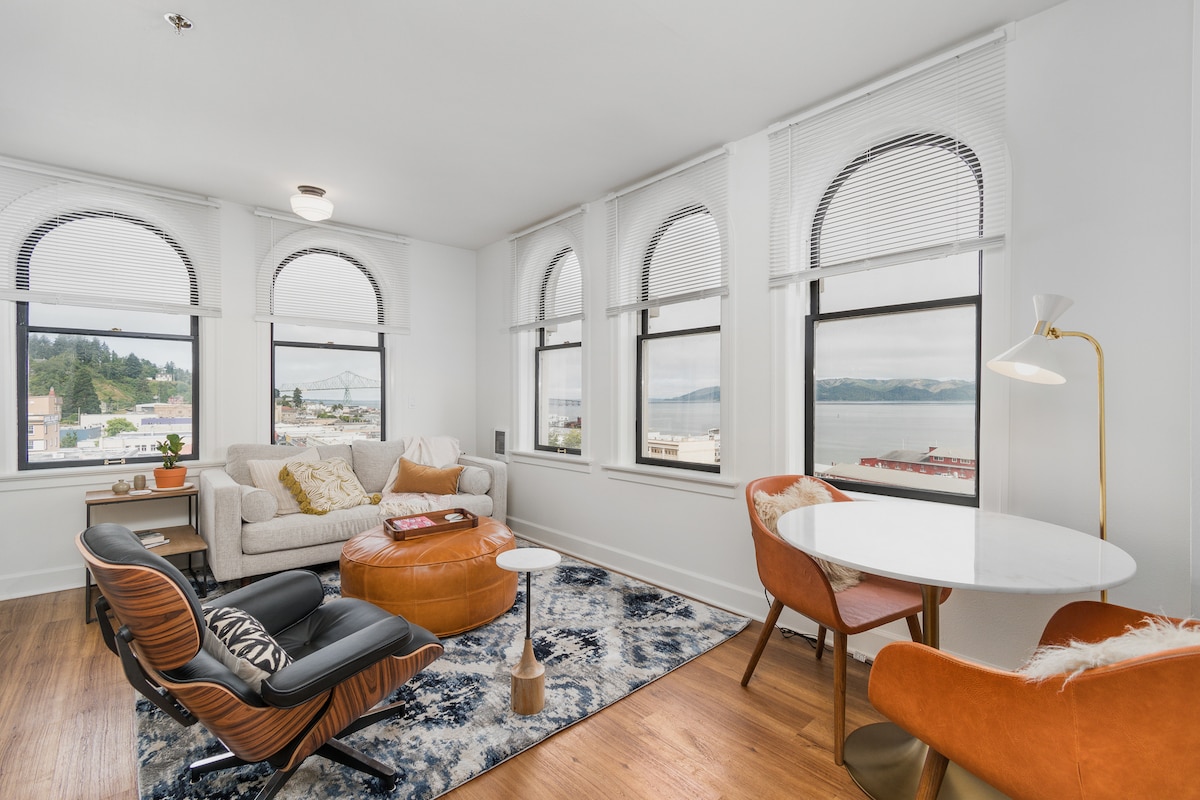 This 7th floor corner apartment is located downtown Astoria, in the historic Astor Building. Guests will feel like a local with a convenient off-street parking space, high-end furnishings, and the best location in Astoria! You'll have the city's best breweries, restaurants, distilleries, shops and more just steps from your downtown apartment.