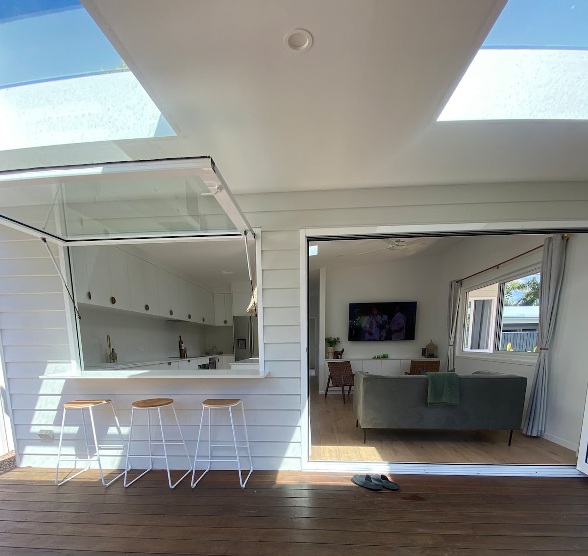 Modern new studio opposite Belongil Beach with a short 10 minute walk to town and a 3 minute walk to the famous Treehouse restaurant and bar. The studio has a separate entrance from the main house. The kitchen has a full fridge, hot plate, microwave ( located in cupboard above the fridge) and air fryer. There is mini weber bbq for guest use. This cabin has everything you need for a lovely seaside break including aircon and a fan.