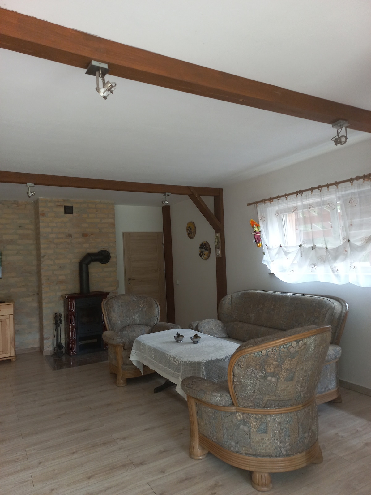 We cordially invite you to our house "Laskowy Brzeg" located on the charming Lake Laskowo, near Chodzież. The entire house is at your disposal, on a fenced plot, with a private playground available to renters. The house is spacious, downstairs there is a large living room connected to an open kitchen (fully equipped), a bathroom, and a hallway. Upstairs there are four bedrooms and a toilet. In two rooms there are fold-out beds with mattresses, in two more there are double beds.