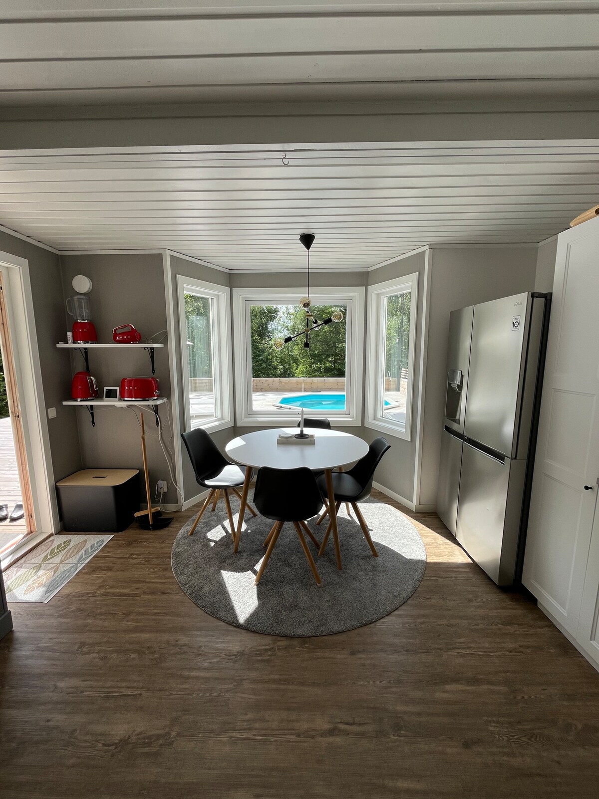 Welcome home to my house in the summer cottage area of Simsjön, located just outside Skövde. Here you have the forest as your closest neighbor, with a spacious balcony of 120 square meters with both a pool and a hot tub. 150 meters away, you can reach the swimming area for those who want to take a swim in the lake. The house sleeps 4 people. One bedroom with a double bed, one sofa bed.