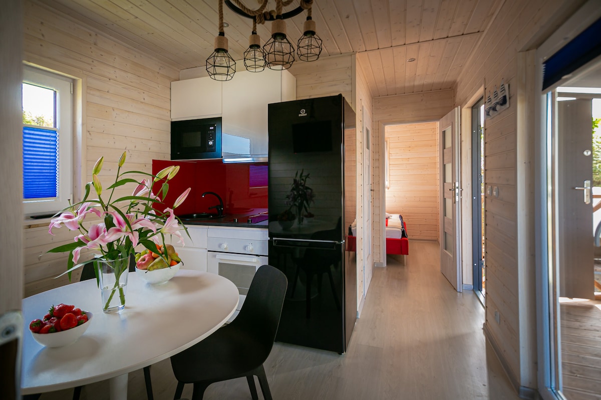 The 48[m2] cottage (including a 12[m2] terrace) has a living room with kitchenette, and two bedrooms. One of the bedrooms has a double bed and the other has a double bed. The kitchen is fully equipped, so there is no need to take your own things with you. The cottage is located on a monitored resort with a playground, a canopy with ping pong and table football and other toys for the little ones. The resort is located next to a forest and it is less than 400 metres to the beach via a forest path.