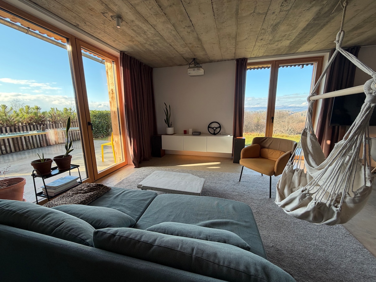 The only tiny house in the area with an amazing location on top of a hill. The little house is small but has it all, a fireplace, kitchen, bathroom, a loft and endless views of the surrounding mountains and valleys. Perfect for couples or even families of 4. Look at the stars through the skylight, experience complete silence and fresh air, go on a hike, rent e-bikes or even relax in the jacuzzi. Dozens of options for day trips and activities. Experience a tiny house life!