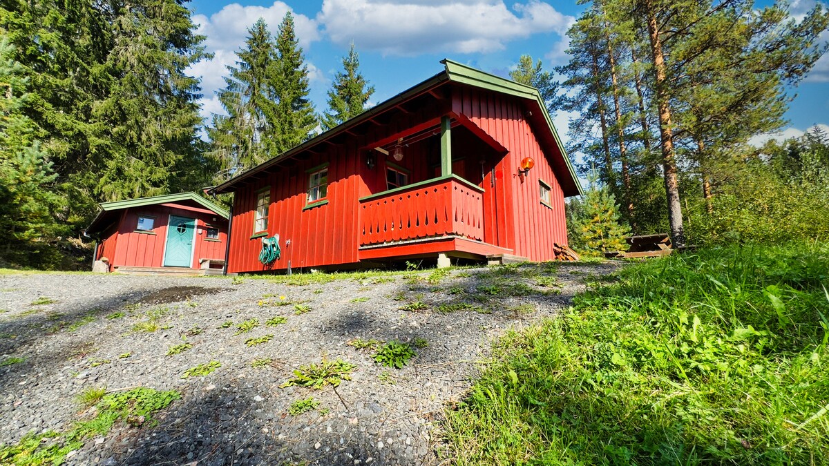 Cozy red cabin with fireplace and parking