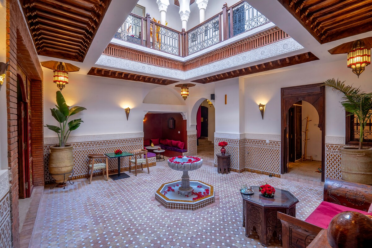 The Scheherazade Suite. Escape to a charming boutique hotel riad in the heart of the Medina, just a short walk from Jemaa El Fna Square. Immerse yourself in pure Marrakchi tradition, with elegant decor, air-conditioned rooms, fast WiFi, and a refreshing plunge pool. Enjoy daily breakfast & housekeeping, plus a stunning rooftop terrace for evening drinks and dinner under the stars. A peaceful retreat with all modern comforts—book your authentic Marrakech experience today!