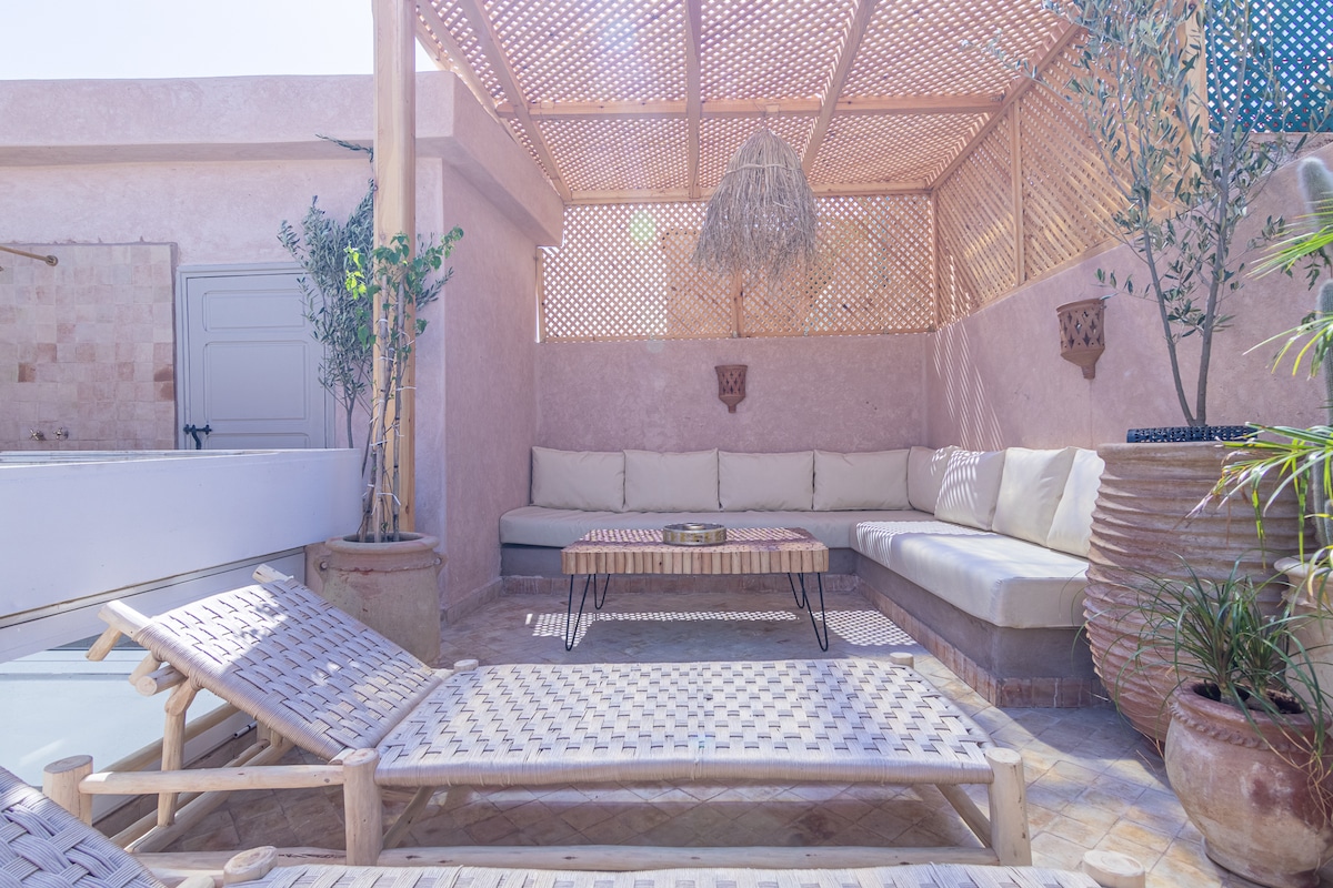 It is a small riad in the heart of the Medina of Marrakech, completely rebuilt in place of a pre-existing ruin. It consists of an entrance, living room with fireplace, dining area, kitchen and bathroom on the ground floor, all rooms are arranged around the patio. On the first floor, there is a double bedroom, a large bathroom, and a hallway with the possibility of a third bed. On the third level, there is a terrace equipped with seating and a breakfast table.