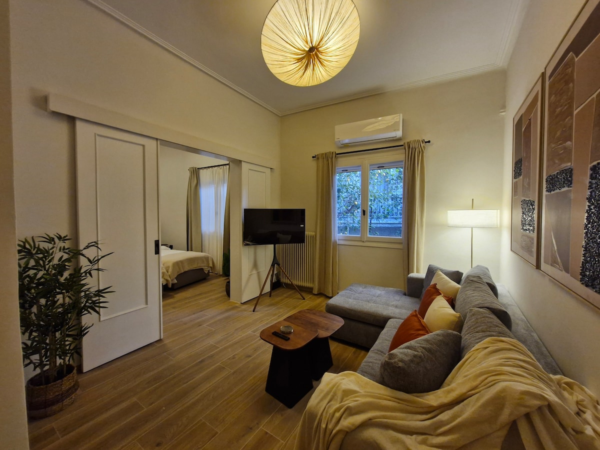 This exquisite apartment is located at Valaoritou street in Agia Paraskevi, one of the most beautiful areas of the southern suburbs of Athens that has a lot of green areas, quietness and safety. Its privileged position offers easy access to Attica Tollway (only 800 m away from junction Y3) and a convenient parking space. In order to go to the center of Athens, visitors will need approximately 11 minutes, as the metro station is only 90 m away from the apartment.The neighborhood has a lot of parks, restaurants,cofee shops,gym and a big super market near byThe whole building, the interior of the apartment and the exterior balkony area are constructed in a way, so that the house is functional and tasteful. Its equipment and furniture are selected with a focus on modern and minimal style. The apartment is arranged so that it can accommodate a couple or a family with (2) children. In the main area, there is a living room with a corner couch that is easily transformed into a bed, situated in front of the fireplace that creates a warm and cozy atmosphere in the cold winter nights. The kitchen is fully equipped with all necessary kitchenware and has a spacious refrigerator, a washing machine and an electric oven. The bedroom has a queen-size bed. When you open the main French window of the living room, you step out in a beautiful balkony with a lot of plants where you can enjoy a coffee, lunch or dinner with the company of friends