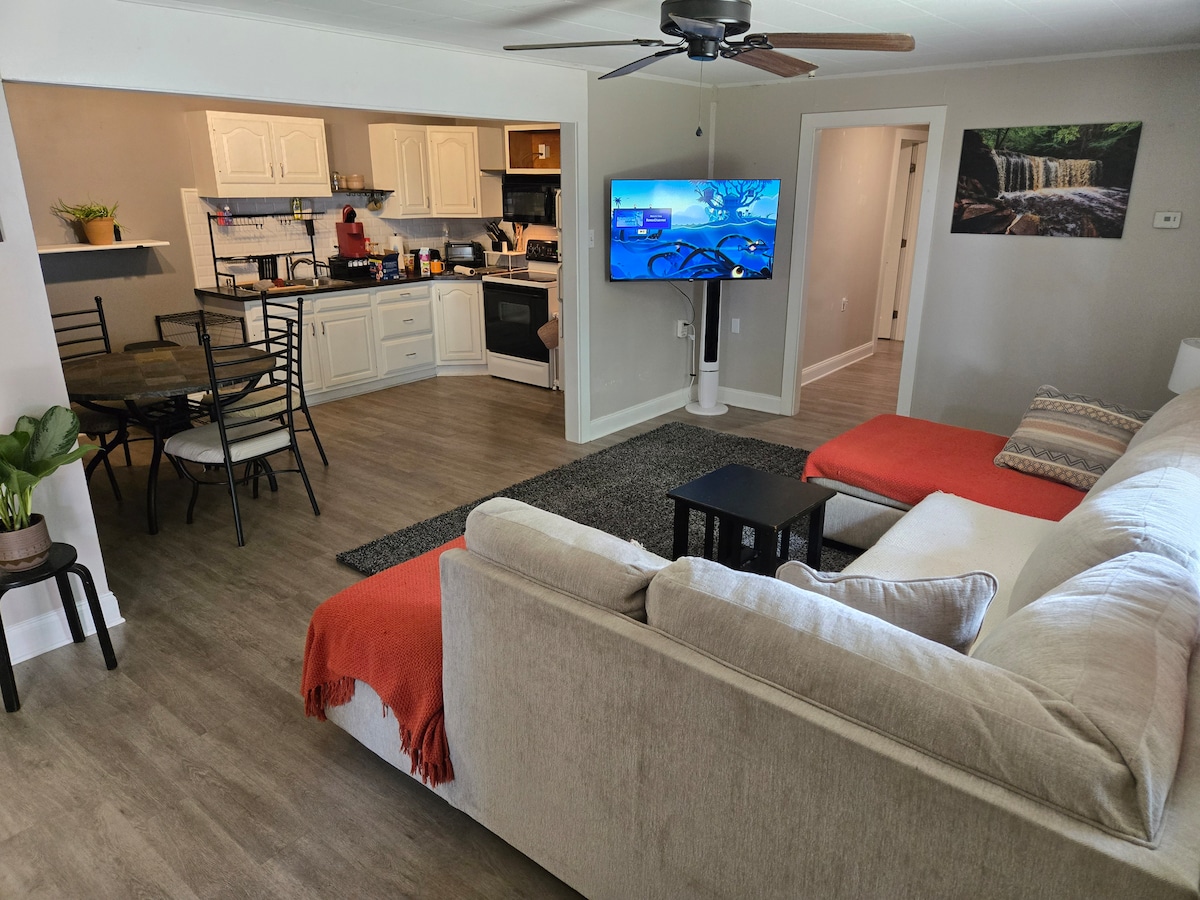 You will be close to everything when you stay at this centrally-located place. South facing, second and third floor unit with 14 windows. Great work space with double 27" monitor wireless keyboard and mouse docking station with a spin bike deck for getting a workout while you're working. 70" TV with 3 couches. Front porch with beautiful views of historic Millionaire’s Row. Bedroom 1: King dresser and closet Bedroom 2: 2 Full beds and closet Bedroom 3: Full & Twin bunk bed