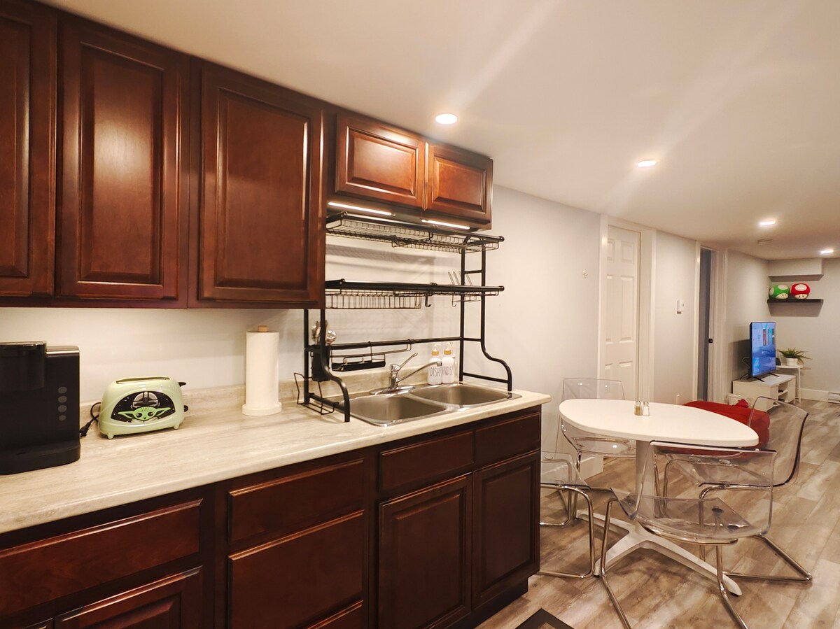 This stylish 1-bedroom basement apartment accommodates up to 4 adults. The space is completely separate and independent from the house upstairs. -The apartment includes a bedroom with a queen-size bed and a pull-out sofa in the living room for additional guests. - Full bathroom -Fully equipped kitchen -Laundry room with washer & dryer -50" Smart TV with Netflix (no cable) -Separate entrance with secure keypad/code access. -Free parking for up to 2 cars. -Located in a very safe neighbourhood.