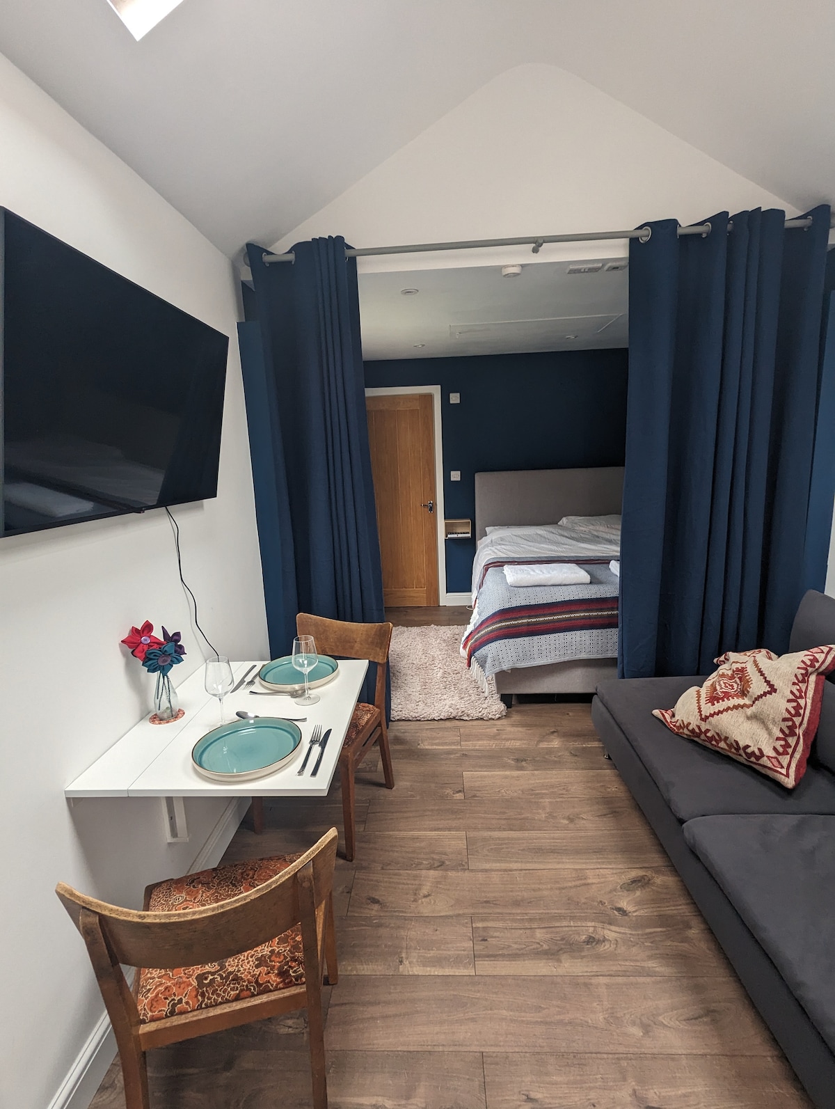 We recently transformed our large, 70 sq. meter, double garage into a stylish, open plan studio apartment with bleached oak, hardwood floor. It is a fantastic, light, and relaxing space with 3-meter bifold doors with integrated blinds that fully open out onto a shared courtyard with our house. There are large electric Velux sky lights with blackout blinds. It is a fantastic light space to relax or work. It has its own private access from the street.