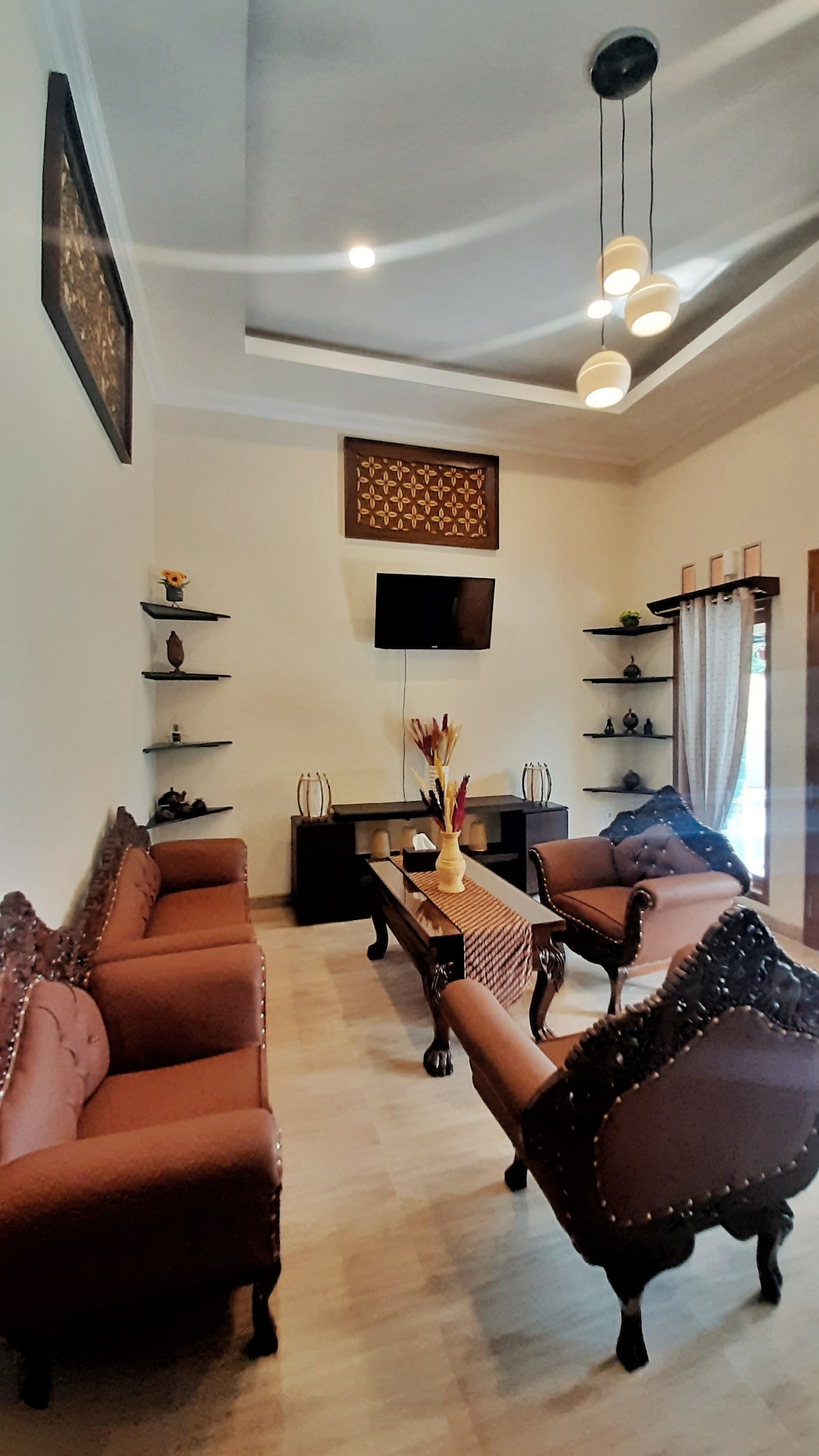 Griya Mundu House area 180m2 or 1937,5 ft2 2 Queen Beds 1 King Bed Garage for 2 cars The house in the middle of Solo Facilities: 1. TV 50 inch (Include Netflix) 2. AC in each room 3. Water heater 4. Wifii 5. Hair dryer 6. Standard Appliance kitchen 7. Washing Machine 8. Iron 9. Microwave 10. Refrigerator 11. Dispenser Other things to note 1. 18 Minutes to the Airport 2. 10 Minutes to Balapan Station 3. 5 Minutes to Sriwedari or Manahan Stadium 4. 10 Minutes to Sheikh Zayed Mosque