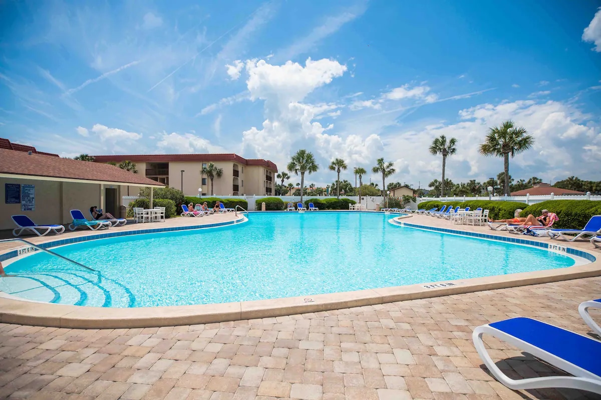 Our little slice of paradise is situated in the heart of St. Augustine Beach right on A1A Beach Blvd. Our unit, recently renovated, is just steps from the beach and closest building to the pool! 2 outdoor pools (1 heated in winter), 5 hot tubs & tennis courts. Perfect location to enjoy our beautiful beaches & all that Anastasia Island has to offer! Historic St. Augustine is less than 7 miles away. Unit is equipped with everything you need for a perfect beach vacation!