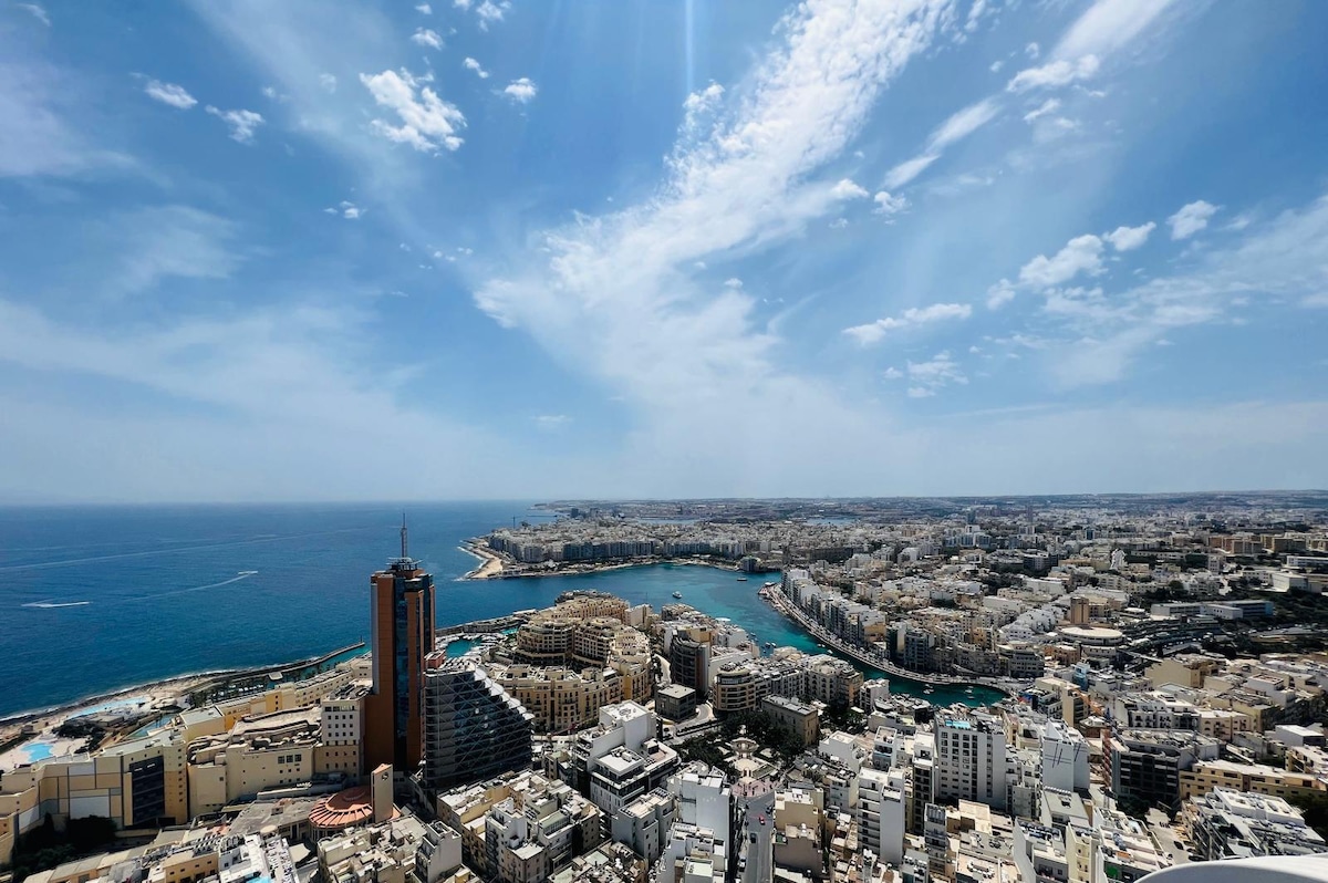 Enjoy in a sophisticated holiday in this magnificent apartment, offering unmatched views of the Mediterranean Sea, located on the 19th floor of Malta' s tallest building: Mercury Tower. Stay in the most central location, where you'll find everything you need in the island's most vibrant area. You will enjoy breathtaking, unforgettable view. The apartment features a double bedroom, a living room with a sofa bed, a fully equipped kitchen, and a bathroom with a whirlpool bathtub. Enjoy your stay