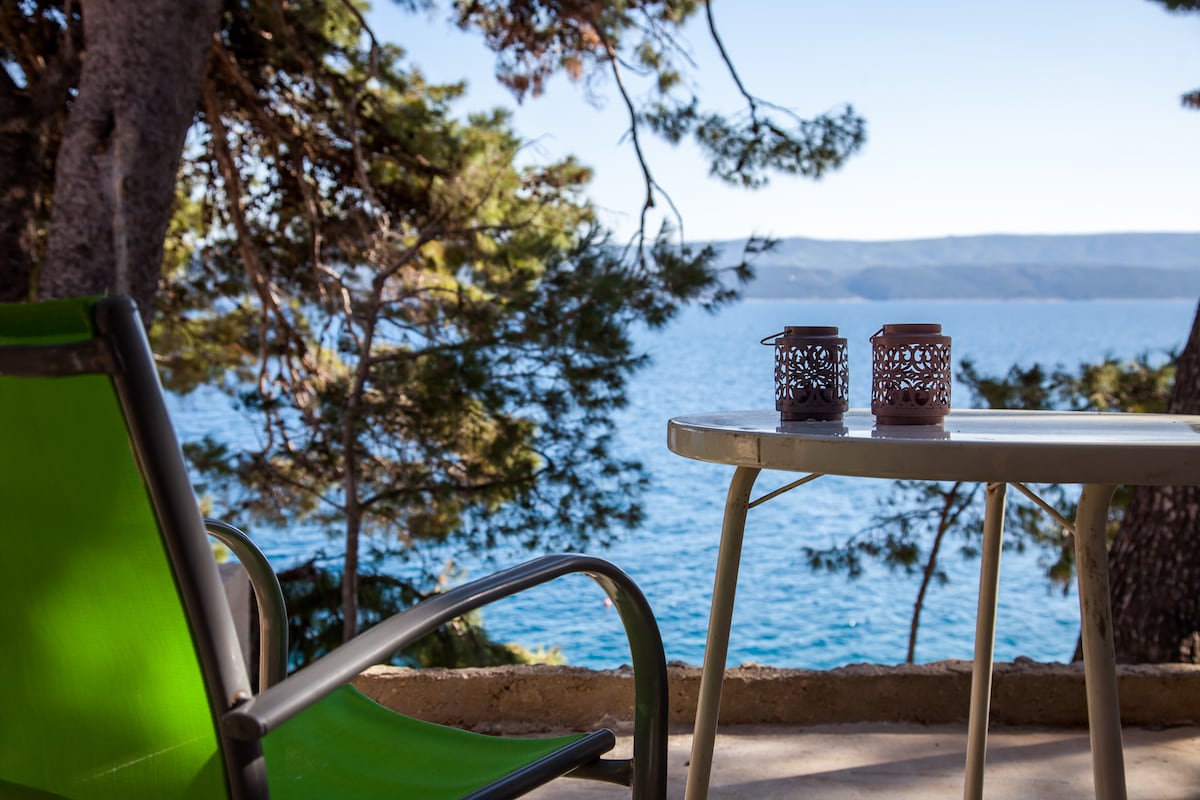 Our little paradise is located on the seafront, has direct entrance to the beach and great view of the sea. We gave our hearts and minds to make 35m2 perfect for up to 4 travelers. Living room and kitchen are fully furnished with plenty of details and sunshine. On the balcony (10m2) you can enjoy little lounge in the shade of the 70 years old pine tree. Bedroom has 1 double bed and 1 is on the loft (has a great sea view). Bathroom features walk in shower. 1 park place is included.