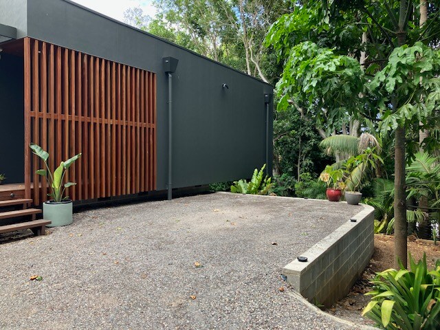 A spacious self-contained retreat with private entrance situated right next to the rainforest. The relaxing interior includes a wood fire, air conditioning and a modern kitchen with all appliances. The marble bathroom is stunning. Outside is a wonderful area for dining day or night with a gas BBQ. Privacy screens separate you from the main house. Enjoy sounds of the rainforest, including lyrebirds, while enjoying coffee and breakfast on the private balcony.
