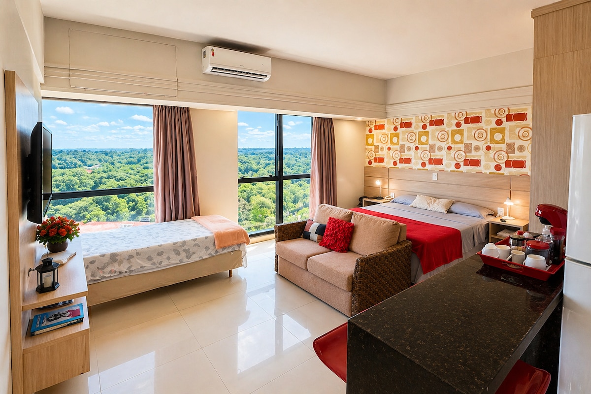 Stay in a modern flat, with a clean design and rooms designed to offer practicality and comfort. Here you will find: • Comfortable queen size bed • Equipped kitchen . River view • Air conditioning and fast Wi-Fi • Smart TV • Building structure with [swimming pool/gym/sauna/parking/24-hour reception] Perfect for business or leisure trips, in a strategic location, close to Shopping, main waterfront, restaurant and airport