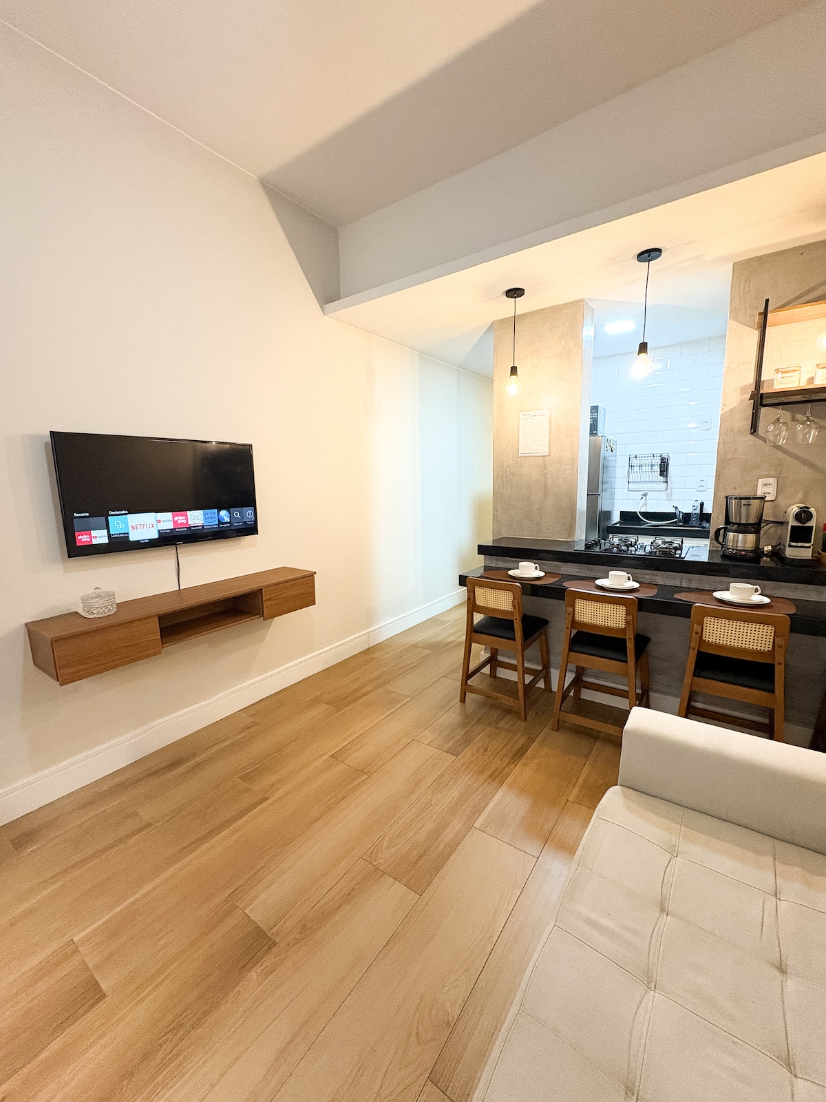 Elegant comfort, strategic location and complete leisure. Quiet with refinement and comfort. Well-located, carefully prepared for a cozy and functional stay. 🛏️ Beds • Bedroom: 1 double bed, ideal for 2 guests • Living room: 1 queen sofa bed, accommodating up to 2 guests • Child: baby mattress for babies up to 3 years old (available upon request at the time of booking) 🧡 Capacity up to 4 guests, as above. ☕ Additional • Aeroccino milk frother (upon request)