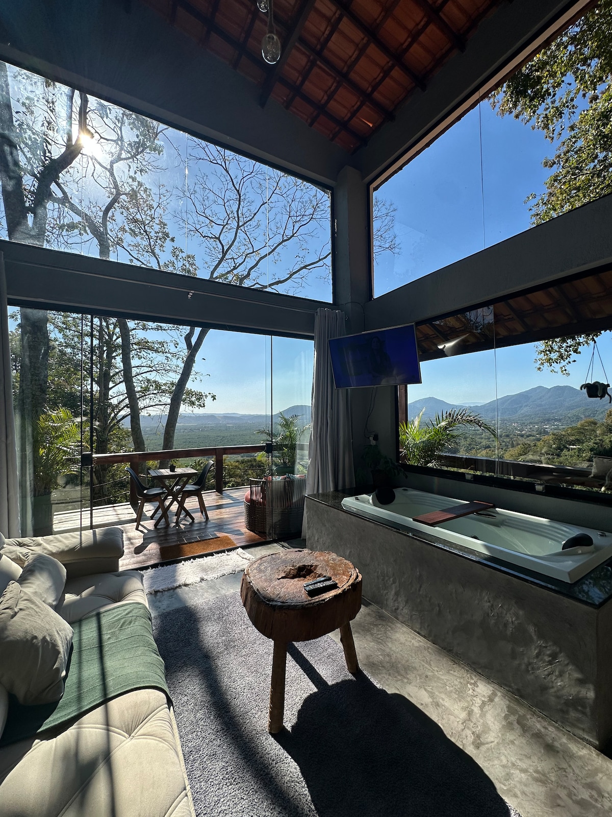 A super romantic cabin in Araras, one of the most charming retreats in the Rio de Janeiro mountains. With bathtub, swimming pool, fireplace, floor fireplace, barbecue, hammock... A little piece of paradise for you to slow down, relax and renew your energies. Surrounded by lush nature, a breathtaking view and full of peace. The cabin offers a lot of charm, sophistication, comfort and impressive architecture. Every detail has been thought out so that you can have a unique experience!