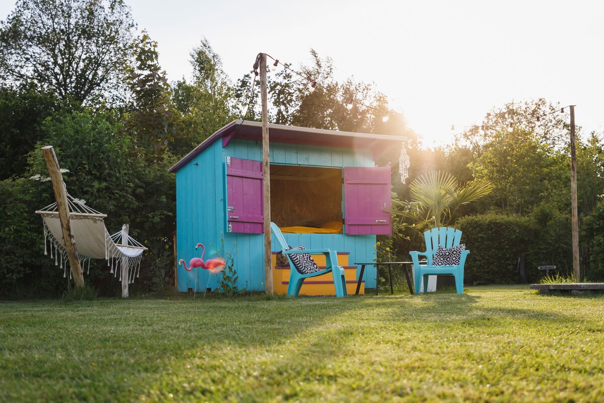 Authentic Tiny Home & Unique Experience: unwind in a handcrafted atmosphere made with love. Enjoy the lounge veranda with heater, stunning views, and the plug & play hottub (no wood needed!) in a unique spot between the porch and nature. Our outdoor space with hammocks, BBQ, and yoga options is built with care. Discover the beautiful area near Giethoorn on rented bikes. A magical summer stay full of creativity and hospitality! See you soon? Love, ByBohemies