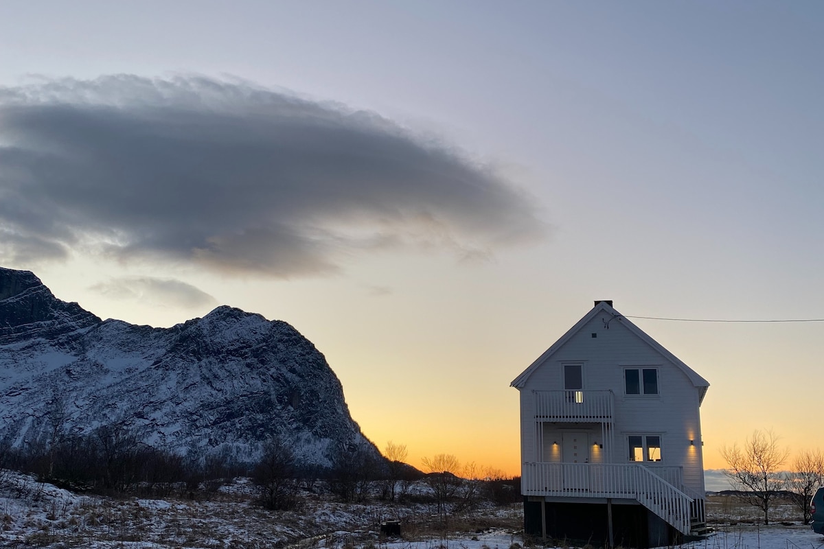 Recharge your batteries in the small cozy white house in this quiet and unique place in the middle of the world's most beautiful nature. Walking distance to mountains and beach, a paradise for nature lovers. The house is nice to be in, it is aesthetically beautiful and recently upgraded with bright colors, original artwork and fine furniture. Here you can really enjoy your Northern Norway vacation!