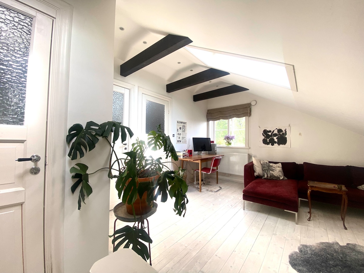 Centrally located close to both swimming, nature, restaurants and the inner city. 70 meters down to the canal with nice walks along the water. Dining room, kitchen and living room in open plan, 3.20 in ceiling height with large windows to the courtyard. One double bedroom and one with sleeping loft (ladder). Possibility of extra mattress. TV with many apps, wifi and bluetooth speakers. Two lush patios with sofa and dining table for lovely outdoors. In cold weather there is a heater. Quiet and quiet location close to the crossroads.