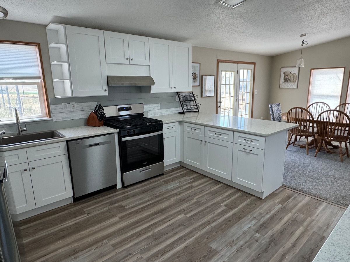 We welcome you to our charming 2-bedroom home, pleasantly located in the heart of Sheridan, WY. A short 5-minute drive to downtown, M & M Ice Rink, Fairgrounds, and less than 20 minutes to the Equestrian Center. This home has a warm and modern design with newly remodeled kitchen, 2 bedrooms (queen beds), quaint office, newly renovated bathroom, and room for the portable crib (provided). Our favorite spot to hang out is on the patio; fenced, covered, grill, and ample space to lounge and relax.