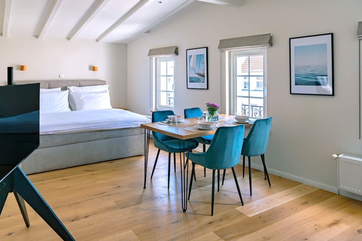 The quiet 56 sqm apartment with underfloor heating is located directly on the promenade, which invites you to stroll, drink coffee and enjoy wonderful food. The lighthouse and beach are about 1-2 minutes away by foot. The vacation home with a modern bathroom and complete household equipment offers a double bed and a sofa bed for up to 4 people. A baby bed can be added if necessary. Linens and towels are included.
