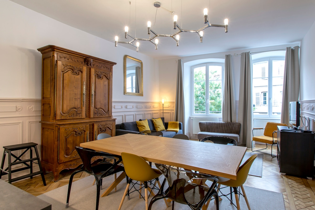 Charming 55 m2 two-room apartment located in the historic center of Strasbourg, 50 meters from Place de la Cathédrale. 3-star accommodation. Large living room with sofa bed, fully equipped open kitchen, large bedroom with built-in closets, exposed beams. On the 4th floor with elevator, the apartment is located between the Gutenberg Parking (100 m) and the Rue des Orfèvres, many shops and restaurants nearby. Free parking 15 minutes' walk from the apartment