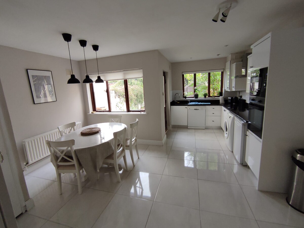 This stylish 5 bed home is acknowledged by Airbnb in the top 10% of homes on their platform🏆It is perfect for a group or a family. Fast WiFi. 20 minutes drive to the city, 5 minutes from N7/N4 main roads. 20 minutes drive to DUB Airport. 10 minute drive to Liffey Valley Shopping centre. With ample safe and free parking for up to four cars at your front door, you can drive or take a 5 minute walk to the bus stop to the city centre. Ideal location to start or finish your trip around Ireland