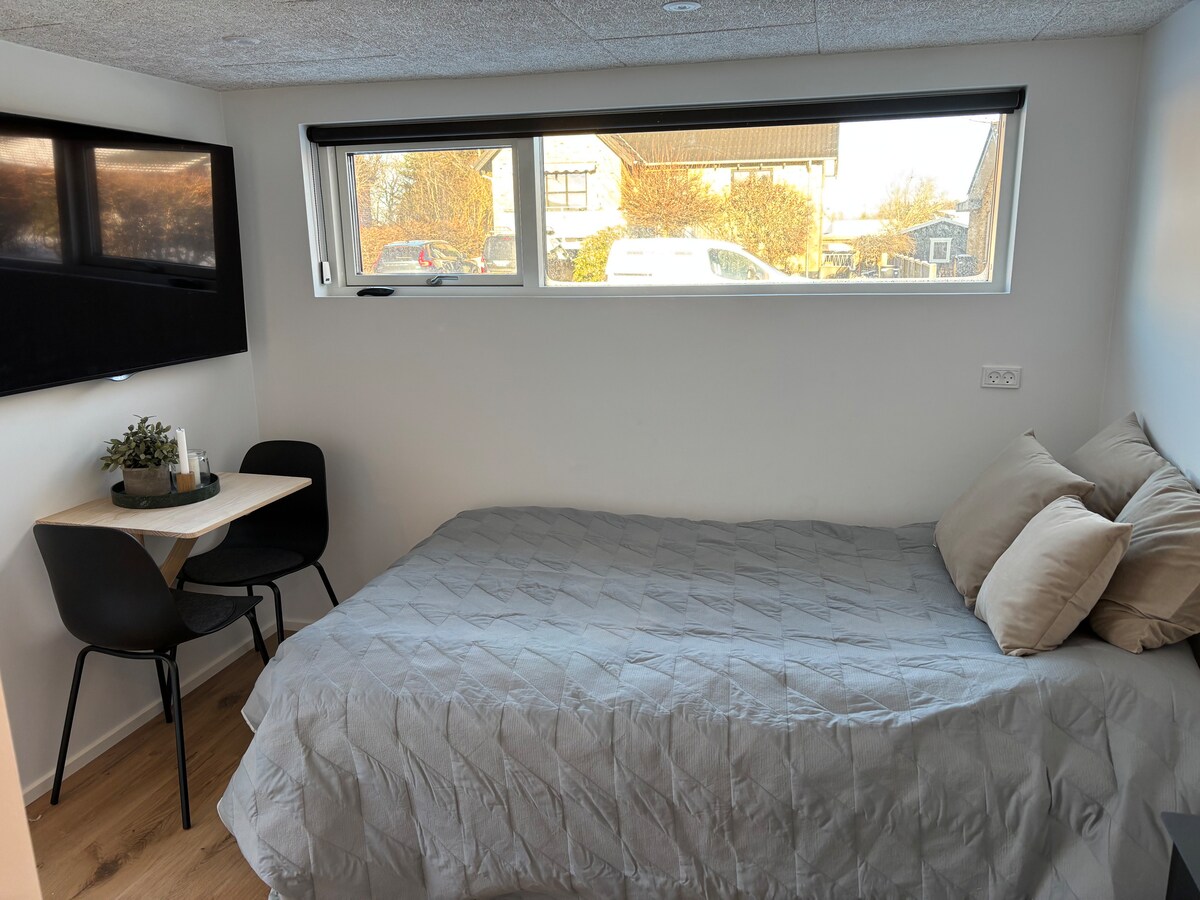 Newly built annex from 2024 in a quiet setting. Located 10 km from Herning and 12 min drive from Messe Center Herning. It is furnished with a double bed (140x200 cm), a table, two chairs, a bathroom with bath and toilet, and a kitchenette with microwave and refrigerator. Service is available. The annex is heated and has hot water.