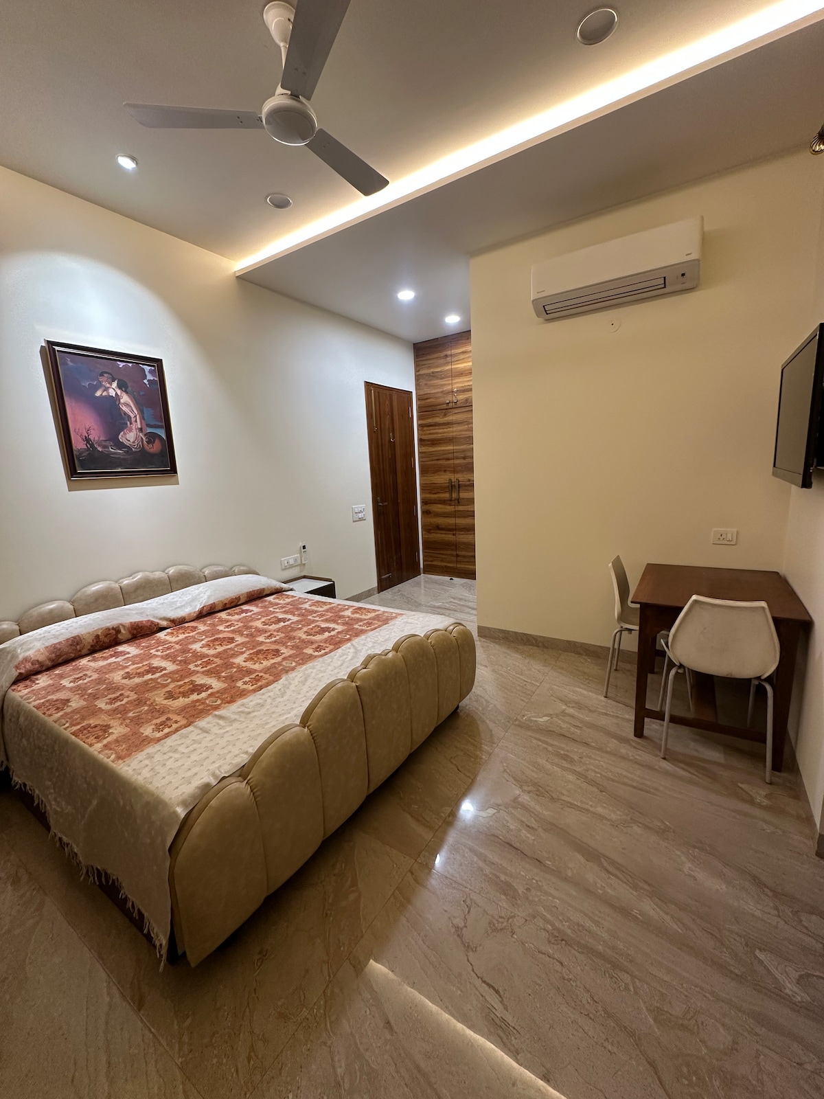 This open-plan studio apartment follows minimalistic design principles. Equipped with a kitchenette, two bathrooms, a full-sized King bed, a queen size Wall Bed, TV with Netflix, Hotstar, PrimeVideo, JioCinema and free WiFi, this space is capable of comfortably hosting a family of four. Please NOTE: This is an open plan apartment, and there are NO private bedrooms, the apartment is on the second floor, so you’ll need to go up two flights of stairs. NO PARTIES PLEASE 🙏🏽 and NO SMOKING 🚭