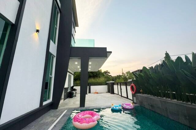 Villa K offers a serene retreat 20 minutes from the heart of Kuala Lumpur, in the township of Rawang. Nestled amidst lush greenery, this holiday home exudes warmth and tranquility. This modular home, showcases a fusion of contemporary style and Malaysian charm, ensuring a enjoyable stay. With impeccable facilities such as a salt water swimming pool and BBQ pit, Villa K promises a rejuvenating experience for guests seeking both relaxation and urban adventure. For commercial use please DM.