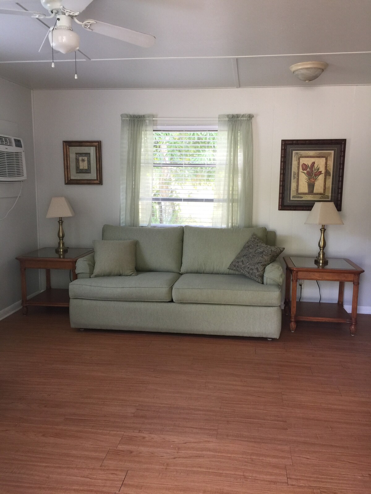 We love our tiny home and everybody that stays loves it too! There is a spacious living room and kitchen area. It has a full bath with tub, a bedroom with a queen size bed, closet, dresser and TV. The home provides essentials for your stay. Just bring your food and clothing. It has a front porch with chairs to enjoy the cooler evenings. It is a short walk to resort amenities, including pool, fitness center and laundry facilities. High speed internet is also available.
