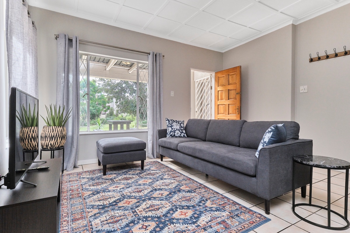 Bright, airy 1-Bedroom Ground Floor Apartment in Fourways. Just 2.1 km from Fourways Mall, near Montecasino & top shopping spots. Relax in a sunny garden with braai. Self-catering. Extra-length queen bed, bathroom with bath & shower. Inverter keeps TV & WiFi running during loadshedding. Free WiFi, Smart TV with Netflix & YouTube. Enjoy the estate’s communal pool and gym. Ideal for couples, friends, or business stays. Book your stay and experience comfort, convenience & a touch of luxury!