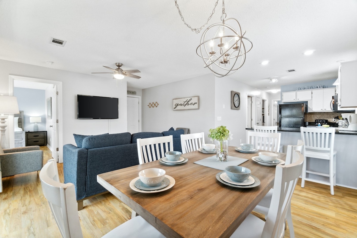 ☀ 5 min easy walk to beach ☀ Walk to restaurants, fast food, stores ☀ Dogs welcome with pet fee ☀ Centrally located and quiet neighborhood ☀ Minutes to Pier Park and and Frank Brown Park ☀ Fenced yard with hot tub, fire pit, picnic area, cornhole Perfect for snowbirds, families, couples or small groups who want plenty to do after spending their day at the beach Sleeps 6: Bedroom 1: King + Twin-Size Trundle Bed (pull out) + En Suite Bath Bedroom 2: Queen Living Room: Twin-Size Pull-Out Chair