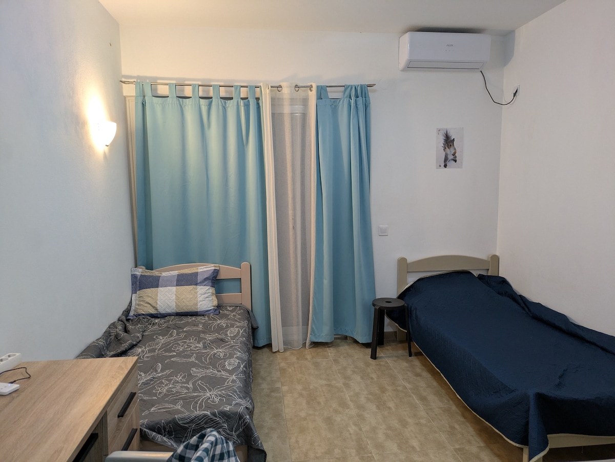 The apartment is located right next to the sea port and the beach. City center, two groceries, a lot of bars and cafes within walking distance. There is one bedroom with balcony and studio area with kitchen, TV, two sofa-beds, dining table and with balcony as well. Both rooms with air condition. In the kitchen you can find any kitchen equipment you would need. You can find all the necessary bedding in the wardrobe and pantry. Small bathroom with a washing machine, washbasin and shower.