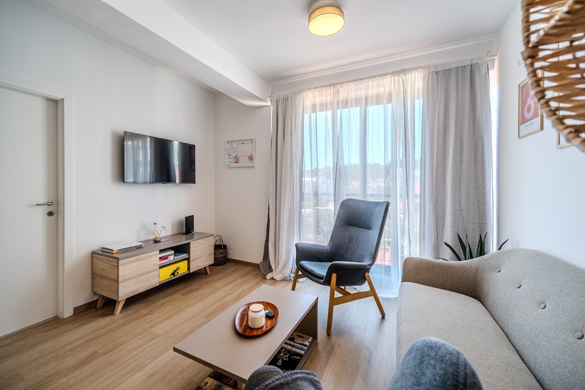 Beautiful apartment is located 200 m from the center of town and the beach. It is located in a quiet part of the place, two minutes walk from shops, restaurants,fish markets, cafes.. In front of the house is a shared pool for guests . The apartment is modernly furnished, has a kitchen, bathroom, bedroom and terrace with a beautiful view of the sea. The apartment is air conditioned and has wifi.