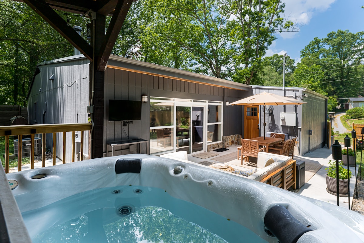 Welcome to your modern oasis, just 10 miles from downtown Asheville, NC! Nestled on scenic Shope Creek Road in east Asheville, this stylish home blends comfort and tranquility. Relax in the bedroom with a king-sized bed, and enjoy the dedicated office space with a day bed—sleeping up to 4 guests. Unwind in the hot tub or around the fire pit with the soothing sounds of the nearby creek. This peaceful retreat offers the perfect escape from everyday life.