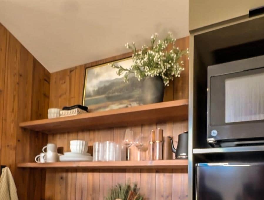Brand New 2025!!! Cabin 18 is a studio style room 1 Queen bed , Pullout sofa, Full Kitchen, Bathroom with large shower, Electric Fireplace. This unit is our most handicapped accessible unit. One level, no stairs, Wheelchair accessible. It is not ADA Certified . Sleeps 2 Comfortably will sleep 4 max with sofa bed $10 per person extra after 2. Location is by Road next to Family unit #17 650 ft from lake. Located at Driftwater Resort Lake Taneycomo