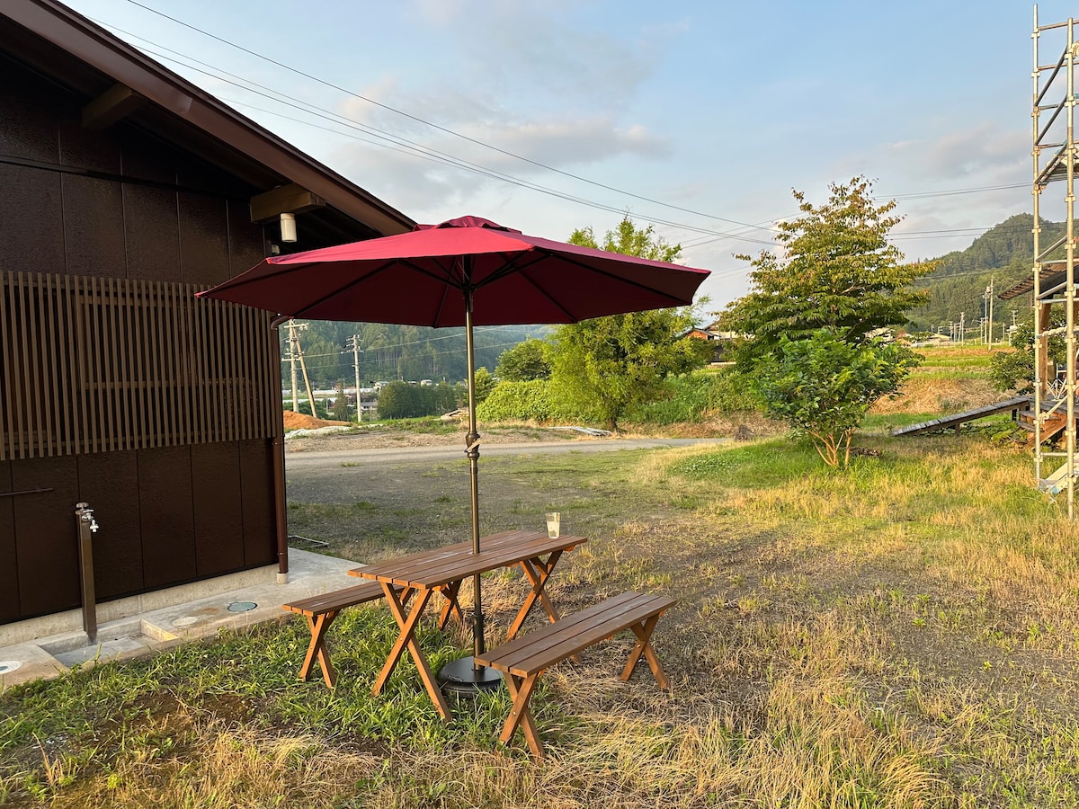 You can freely use the simple guest house. It can accommodate up to 5 guests, but I think it is comfortable for 4 guests. There is a large parking lot. The guest house is fully equipped with a kitchen, toilet and shower. There is also a barbecue facility, so you can enjoy a leisurely meal while looking at the natural scenery. If you are on a motorcycle tour, you can enjoy a campfire while looking at your motorcycle. I confidently recommend it to families and hobby groups. The main attraction is the barbecue while looking at the rural landscape. When the sun goes down, the cool breeze from the Northern Alps is pleasant, and you can lose track of time while enjoying yourself.