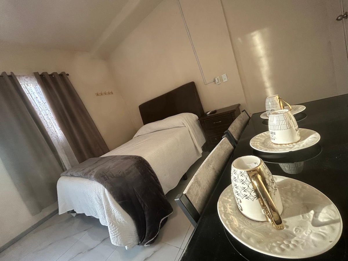 Experience a delightful loft retreat perfect for business travelers and long stays, featuring modern amenities and a serene garden atmosphere. - Kitchen with fridge, micorwave and stovetop - Work space with ergonomic chair and work lamp. - 150MB WiFi by Starlink. - Full size bed - A/C - TV 42" with Netflix - Dining table 2 chairs - Bathroom with towels, soap and medicine cabinet - Great location, 7 minutes from International Bridges and the Consulate, 3 minutes from the Highway.