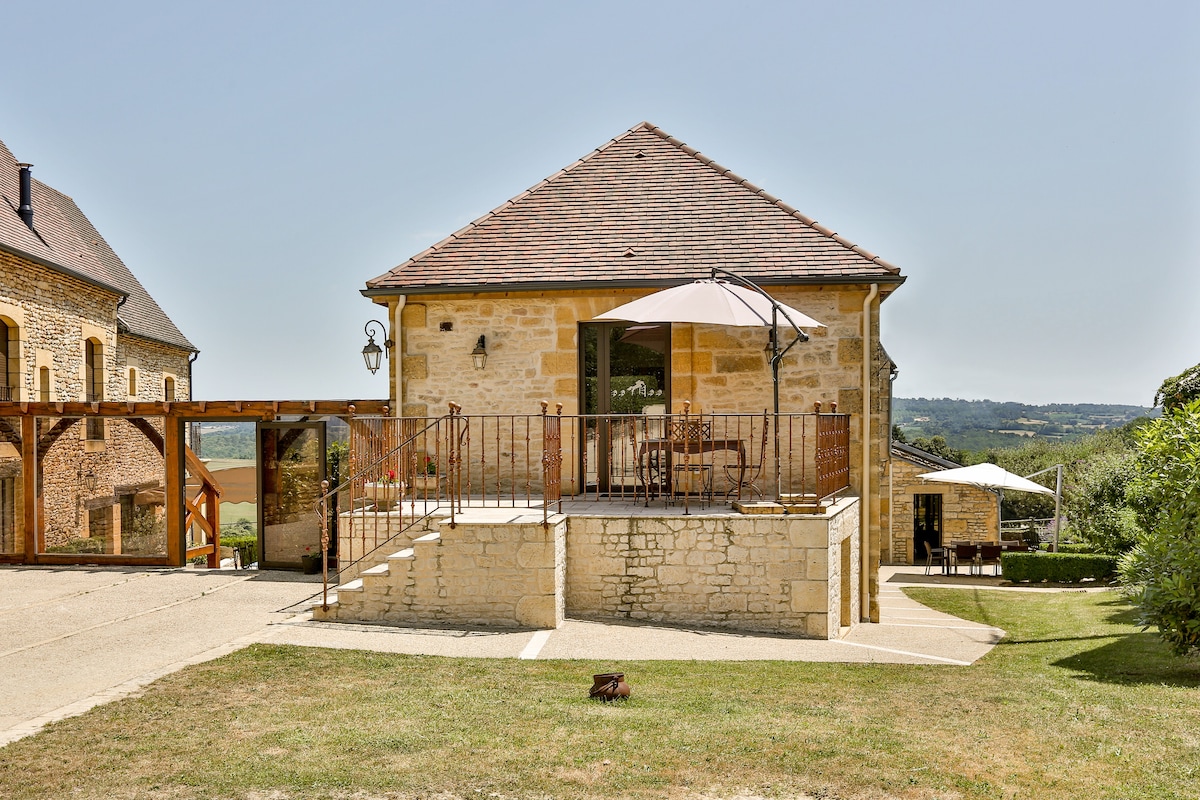 9 km south of Sarlat, Borietta is perched on the rocky ridge of Marqueyssac. This traditional Périgord stone house offers a spectacular view of Domme, La Roque-Gageac, and the Dordogne River. Nestled in the heart of the valley of 1001 castles, it enjoys an ideal location to explore the most prestigious sites of the Périgord Noir. You’ll be charmed by its peace, authentic character, and modern comfort in a truly unique natural setting.