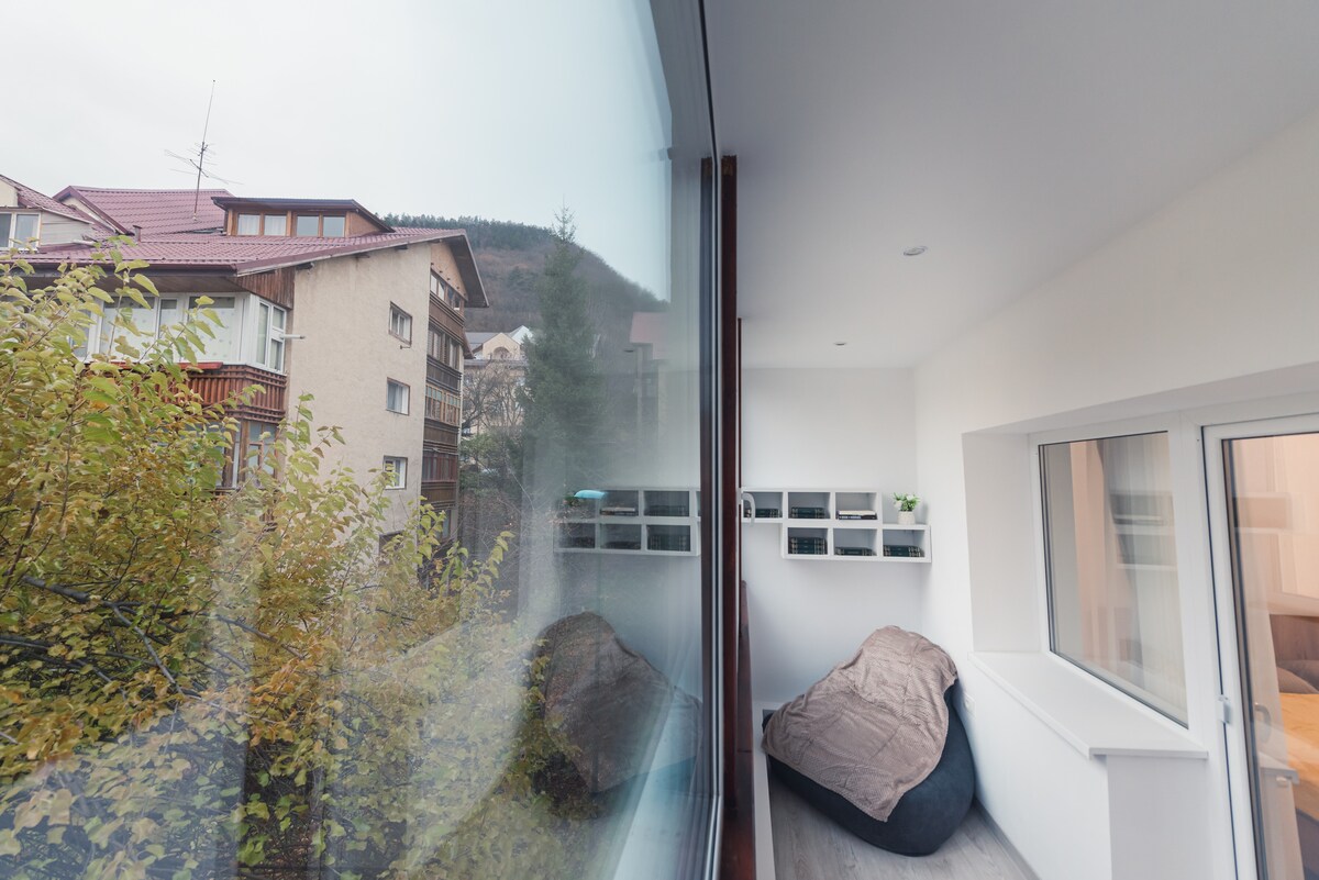 Stylish space with a unique cozy feel. Enjoy amazing views over the city skyline and best natural landscapes in Brasov. Engulfed by nature, yet centrally located and well connected. Explore the surrounding trails and Tampa reservation, while being a stone throw away from the historic centre of Brasov. After a full day, kick back and relax by the indoor fireplace, or enjoy the fresh air on the beautiful terrace while experiencing an unparalleled level of privacy and tranquility.