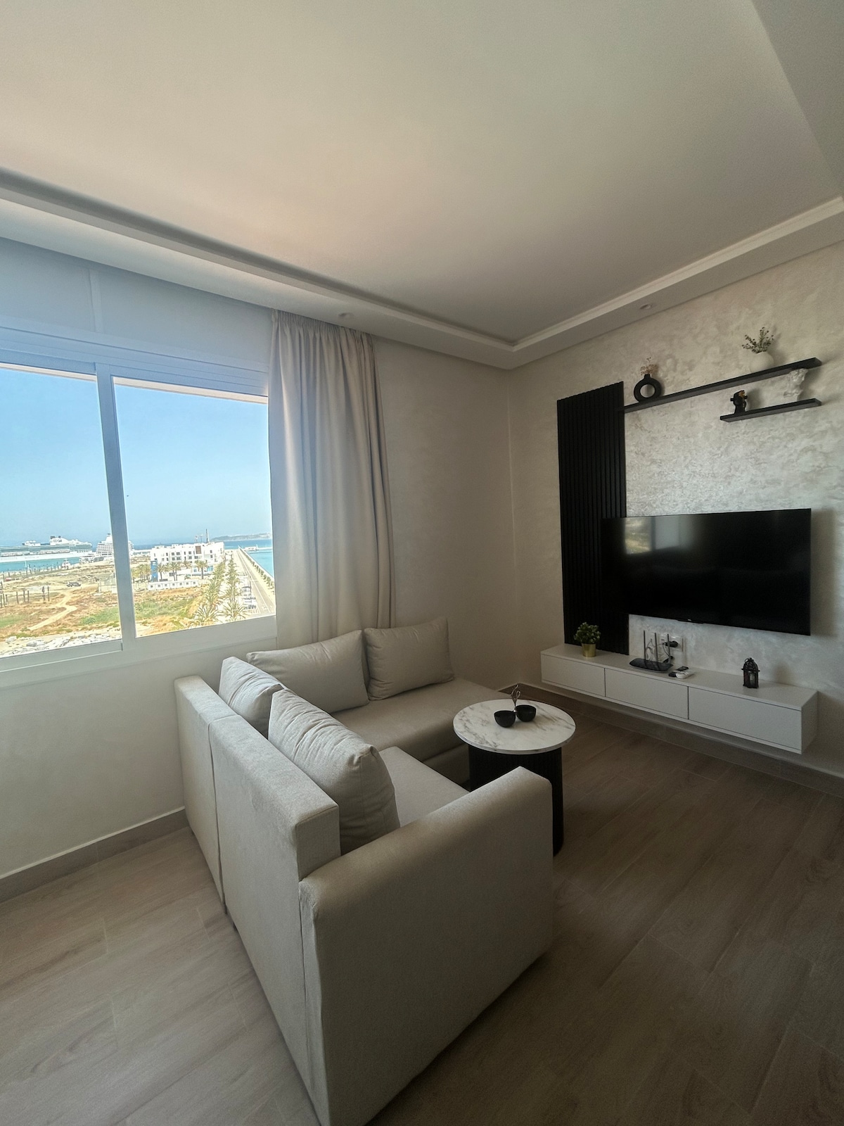 Vous êtes à la recherche d'un appartement moins cher qu'un hôtel. Découvrez cet appartement luxueux en plein centre-ville de Tanger et avec vue partielle sur mer, à 2 min de Marina ,près des cafés et boutiques ,du Mall Ibn Batouta ,de l'ancienne médina et monuments historiques .Le point de départ idéal pour explorer la ville. Cet élégant appartement d'une chambre, un salon ,une terrasse vue mer ,une cuisine américaine , un climatiseur , une WIFI , ( espace de travail ) , smart TV .