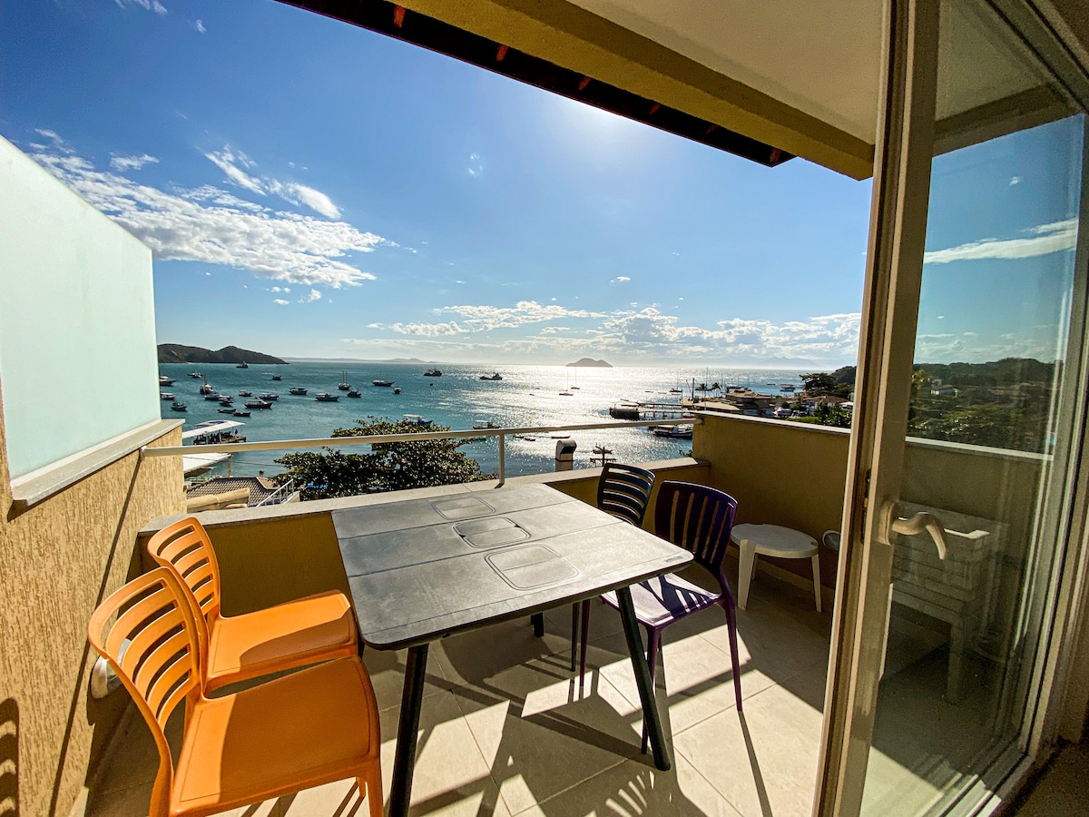 Amazing flat with a paradisiacal view of the famous Orla Bardot. The condominium is a 5-10 minute walk from Rua das Pedras, close to several restaurants, beaches and boat rides. The flat contains: a bathroom, kitchen/bedroom and balcony with TV, air-conditioning, refrigerator, portable electric cooktop, coffee maker, microwave, sandwich maker, etc. In front of the condominium is the pier for water taxis to other beaches and islands, and also the arrival point for ocean liners.