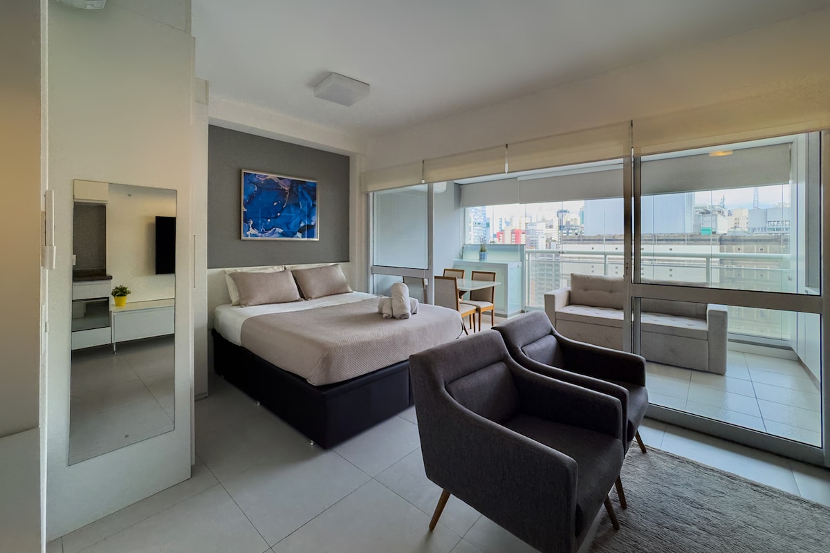 The studio is brand new, well-decorated, and equipped with high-quality products, providing comfort and coziness for your stay. The building is located in the center of São Paulo, in the Bela Vista neighborhood, well-known for its pasta restaurants and easy access to the city's main tourist attractions, transportation, and event centers. The building is residential, with 24-hour security, parking, and an elevator. We have more studios in this building in case you come with your family!