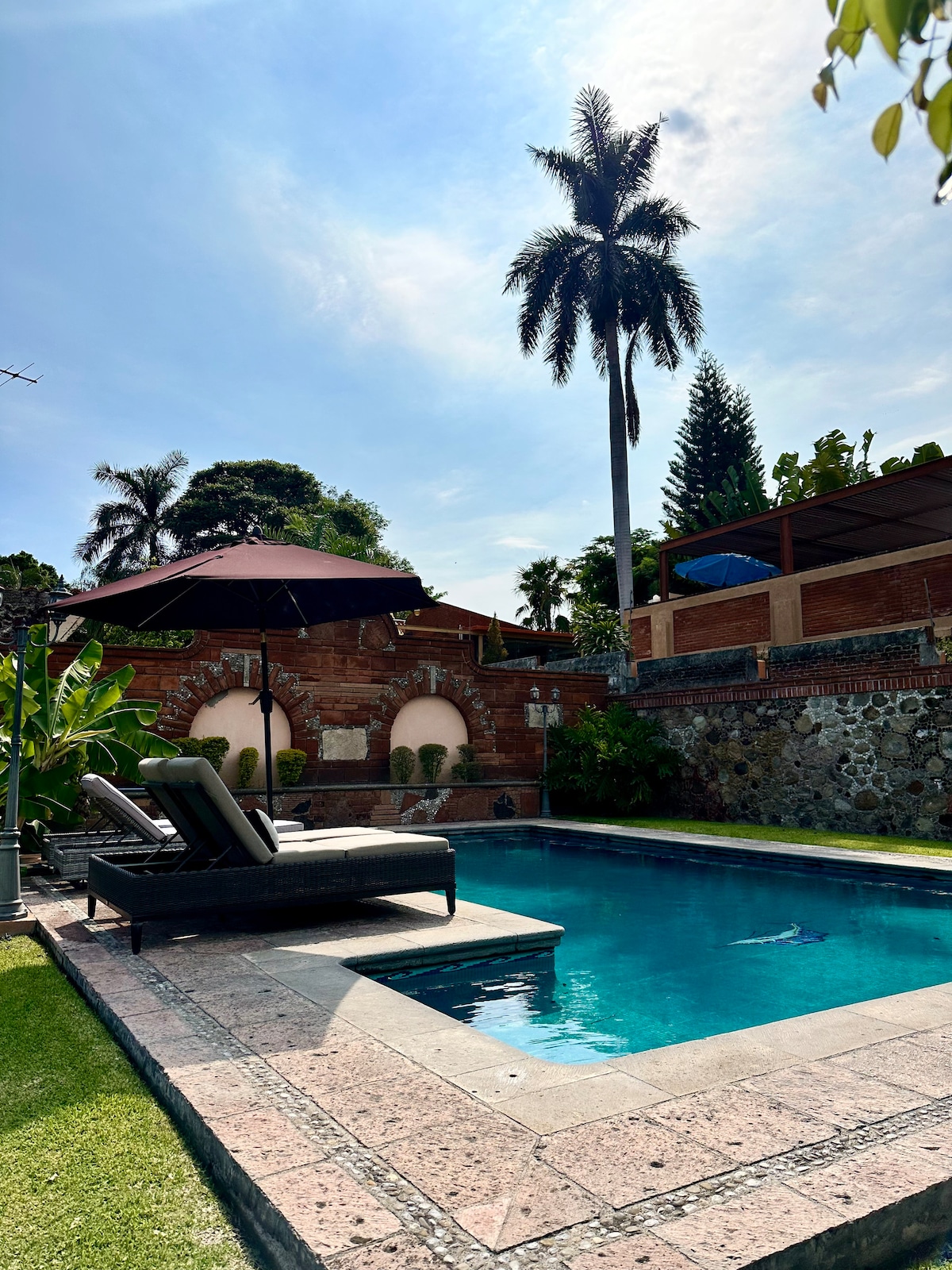 Amazing house in one of the best areas of Cuernavaca. You can breathe tranquility in this house. There is no noise from outside, other than from nature. It has a beautiful garden and a large pool area with lounge chairs. The house is fully equipped with air conditioning, wifi, television, netflix, etc. The perfect place to relax!! There is another house on the property, but they are completely independent and each one's privacy is respected.