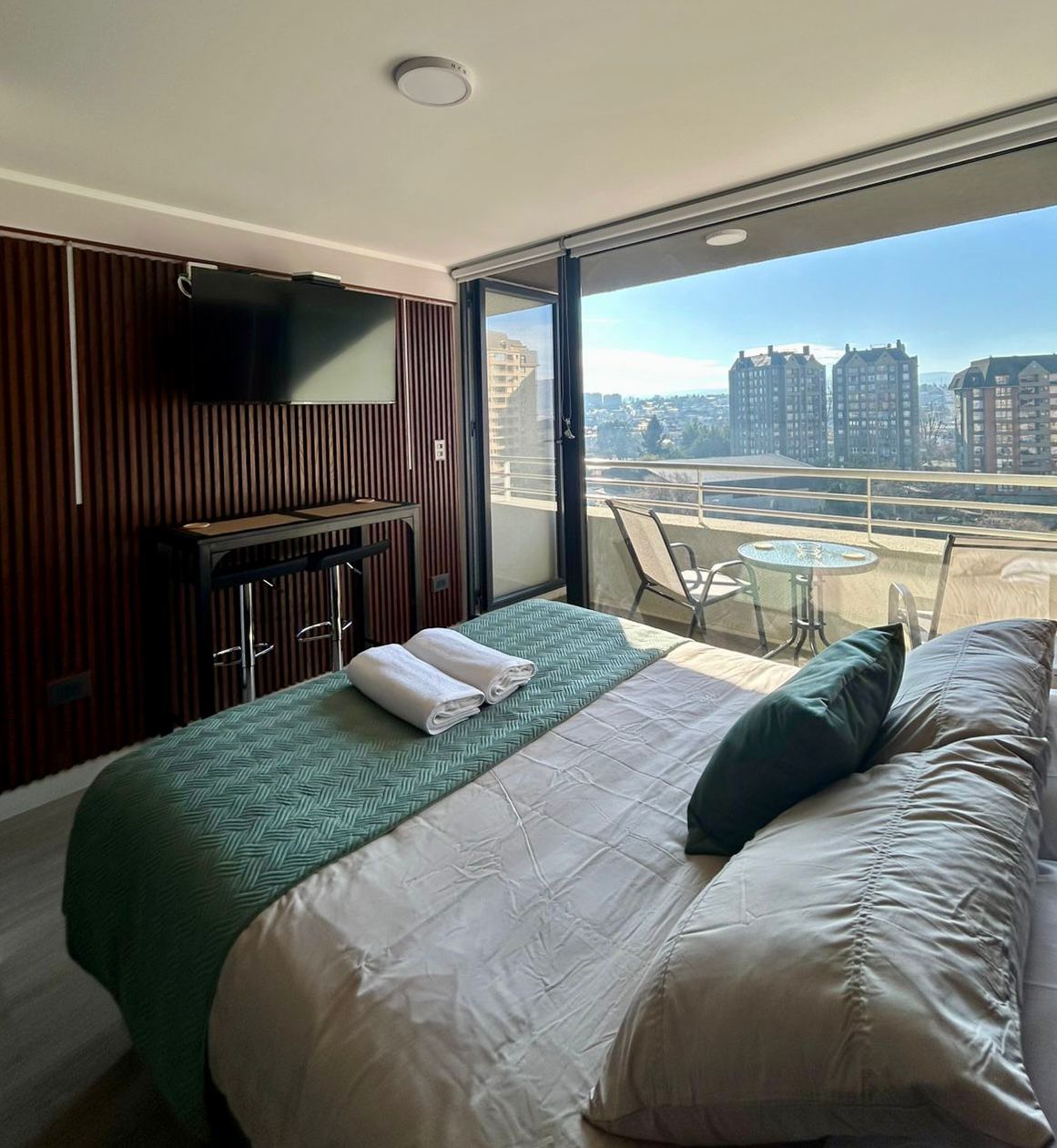 Premium apartment 9th floor with terrace Downtown Temuco! Andrés Bello 255 – 8 min Hospital, unis, clinics, supermarkets. Panoramic view. Max 3 people: 2-seater bed + sofa bed. Space: • Smart TV + sofa bed in the living room • Bedroom: 2-seater bed, premium sheets/towels • Kitchen: oven, microwave • Bathroom with shower • Wi-Fi + own parking Building: Washer/dryer, gym, meeting room. Check-in concierge. Pro cleaning. Book now! ⭐